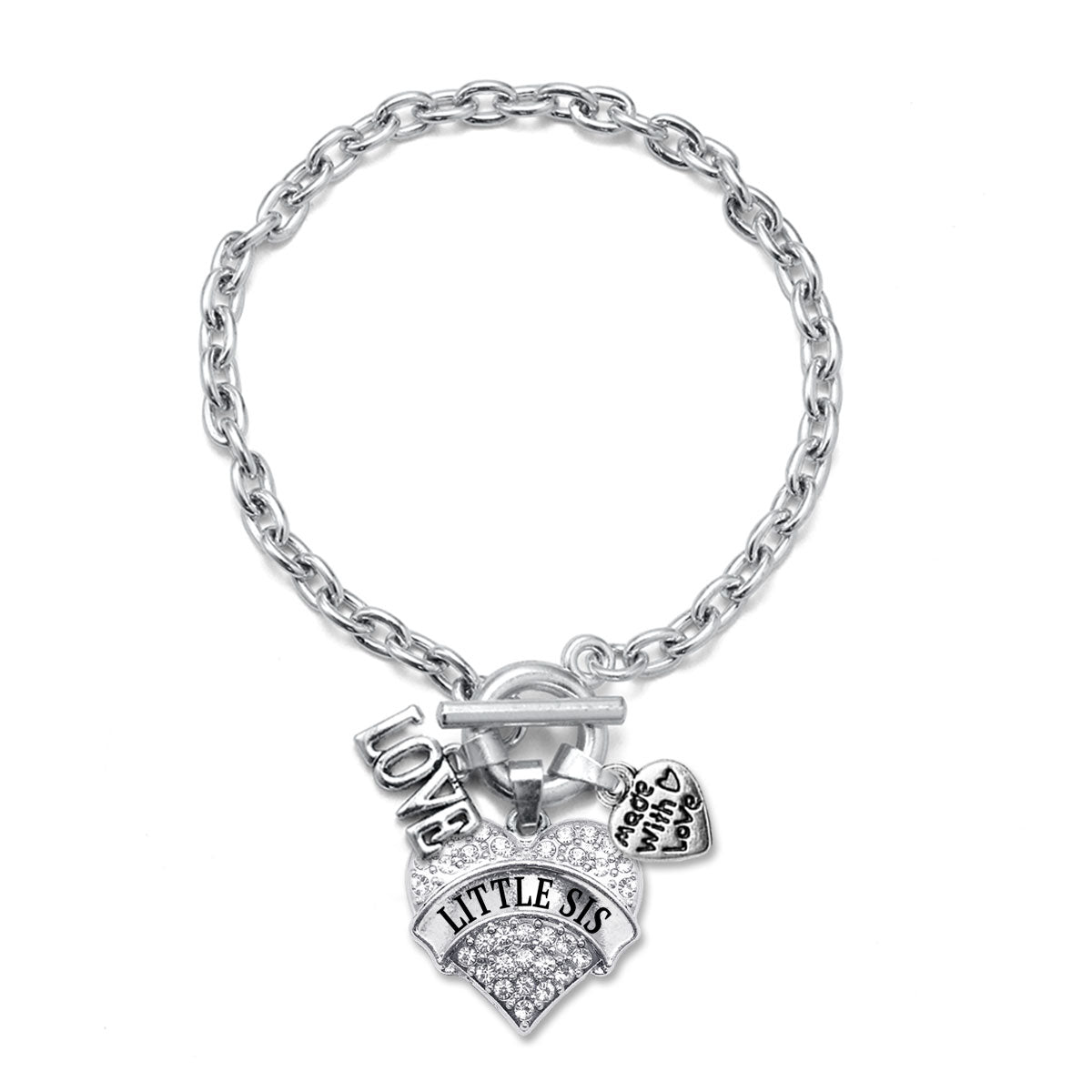 Our sparkling toggle bracelet, equipped with a stylish toggle clasp and the Love Little Sis pave heart charm, is crafted from white metal with a silver plated finish and accented with cubic zirconia stones.