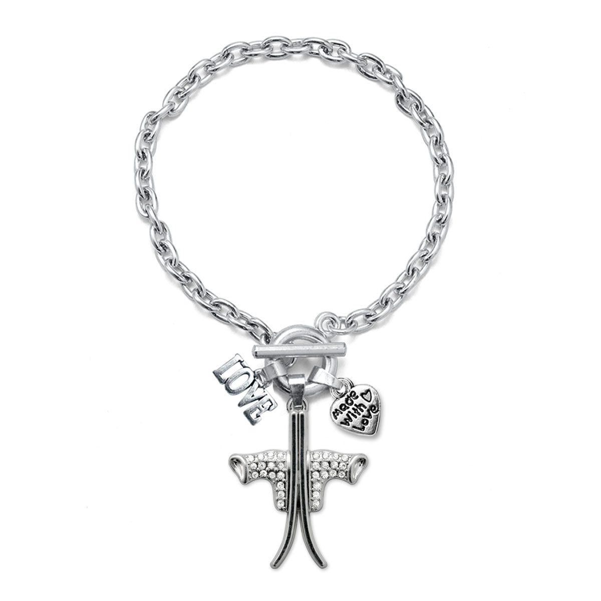Our sparkling toggle bracelet, equipped with a stylish toggle clasp and the Love Skiing charm, is crafted from white metal with a silver plated finish.