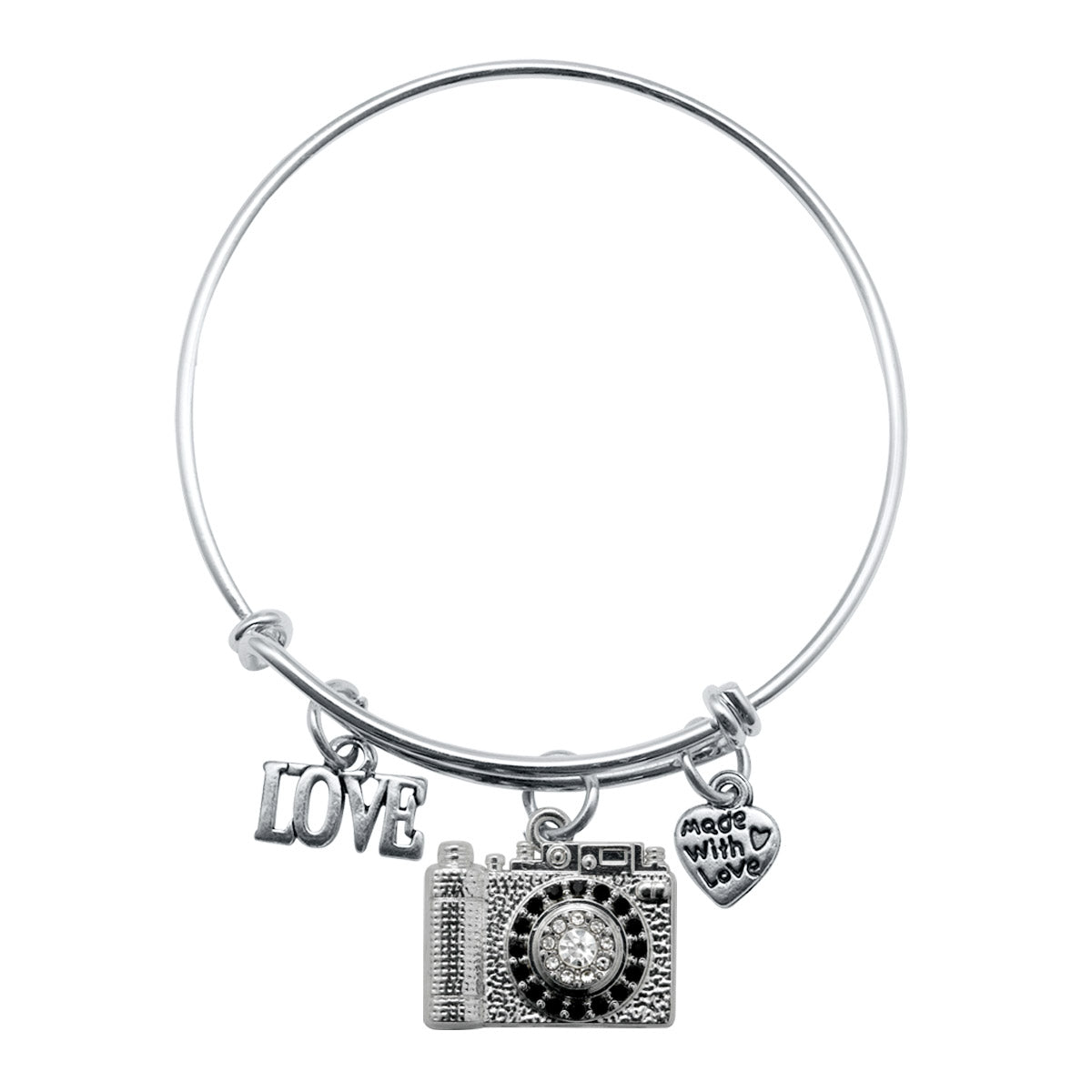 Silver Love Vintage Camera Charm Wire Bangle Bracelet