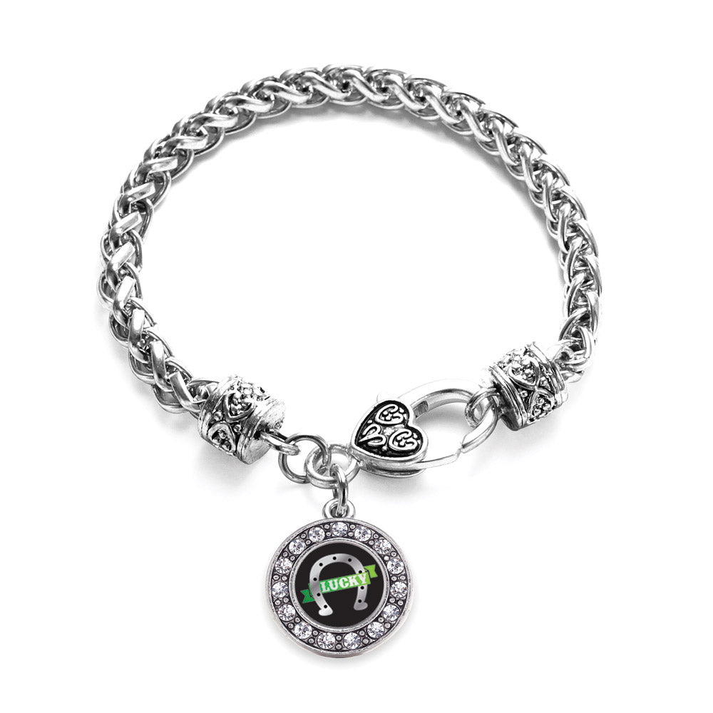 Our sparkling braided bracelet, equipped with a stylish lobster claw clasp and the Lucky Horse Shoe circle charm, is crafted from white metal with a silver plated finish and accented with cubic zirconia stones.