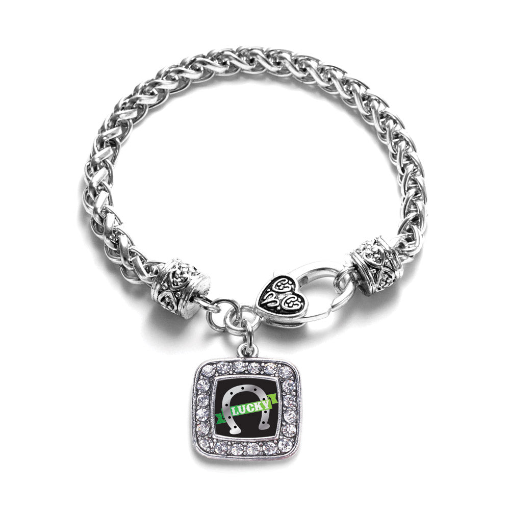 Our sparkling braided bracelet, equipped with a stylish lobster claw clasp and the Lucky Horse Shoe square charm, is crafted from white metal with a silver plated finish and accented with cubic zirconia stones.