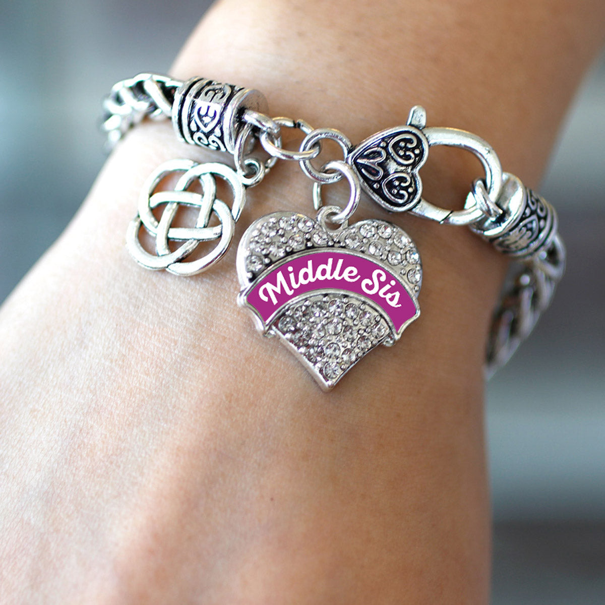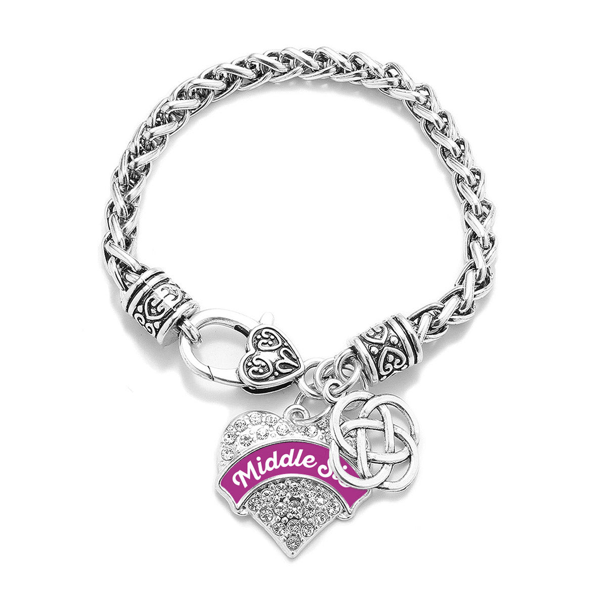 Our sparkling braided bracelet, equipped with a stylish lobster claw clasp and the Magenta Middle Sis Celtic Knot pave heart charm, is crafted from white metal with a silver plated finish and accented with cubic zirconia stones.