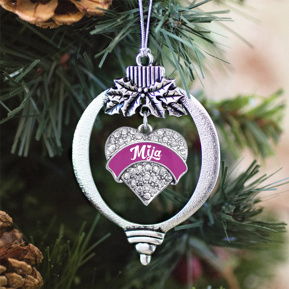 Our sparkling holiday ornament, equipped with a stylish silver rope and the Magenta Mija pave heart charm, is crafted from white metal with a silver plated finish and accented with cubic zirconia stones.