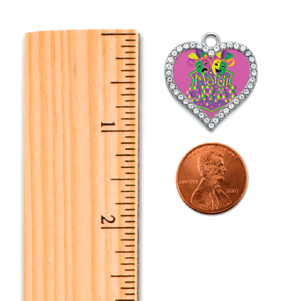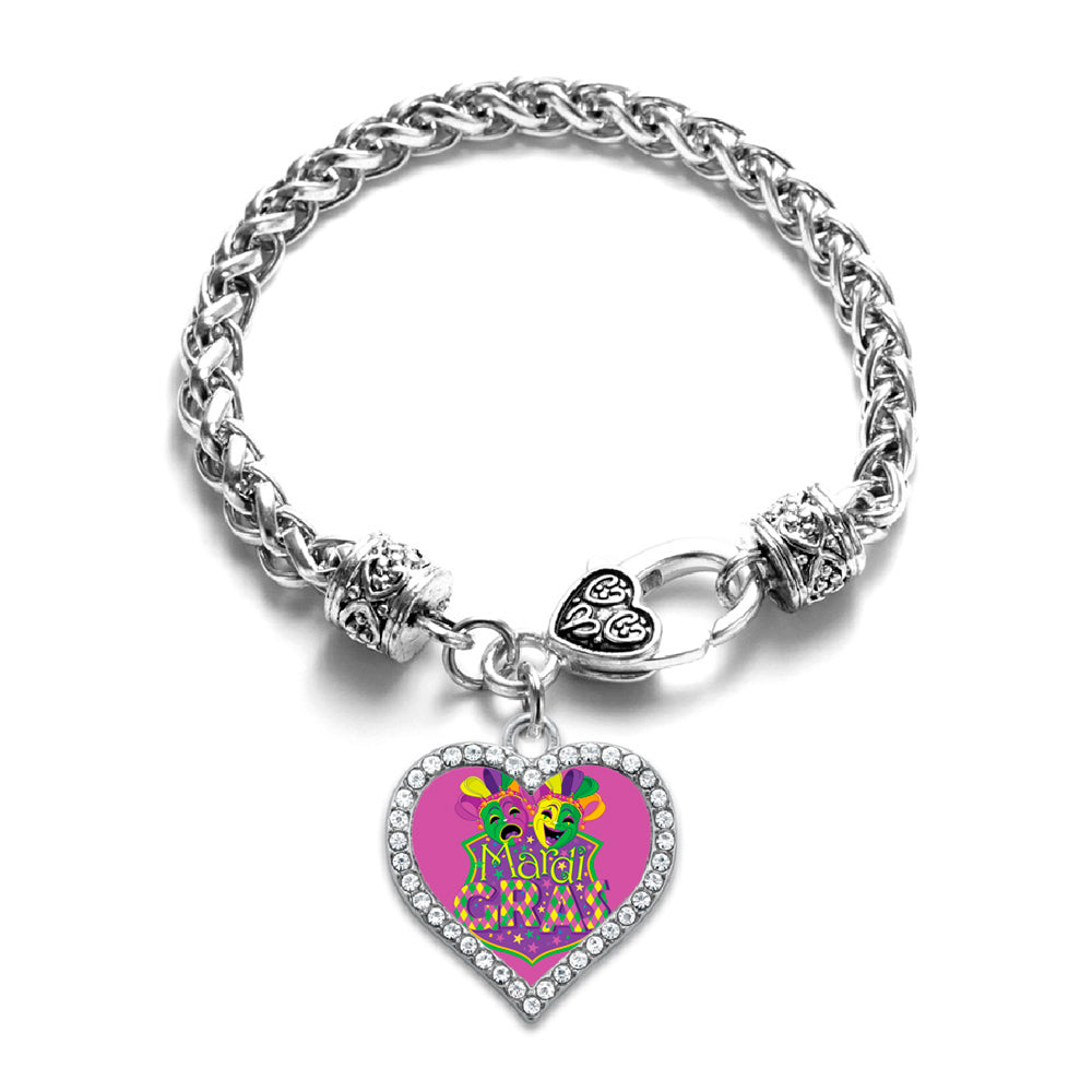 Our sparkling braided bracelet, equipped with a stylish lobster claw clasp and the Mardi Gras Masks open heart charm, is crafted from white metal with a silver plated finish and accented with cubic zirconia stones.