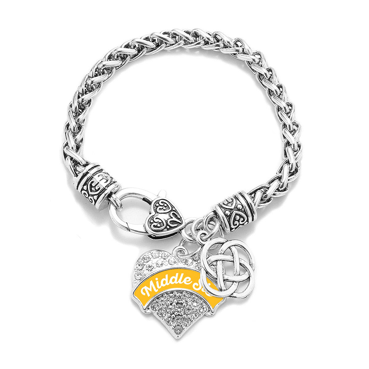 Our sparkling braided bracelet, equipped with a stylish lobster claw clasp and the Marigold Middle Sis Celtic Knot pave heart charm, is crafted from white metal with a silver plated finish and accented with cubic zirconia stones.