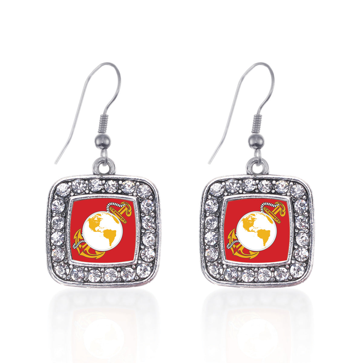 Our sparkling dangle earrings, equipped with a stylish french hook backing and the Marine Symbol square charm, is crafted from white metal with a silver plated finish and accented with cubic zirconia stones.