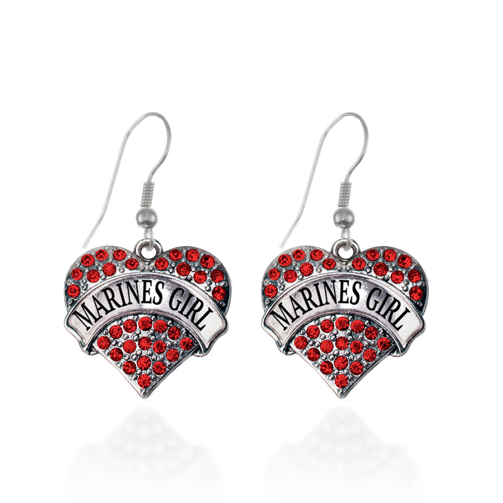 Our sparkling dangle earrings, equipped with a stylish french hook backing and the Marines Girl red pave heart charm, is crafted from white metal with a silver plated finish and accented with cubic zirconia stones.
