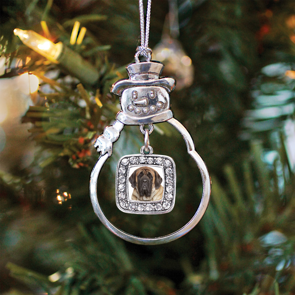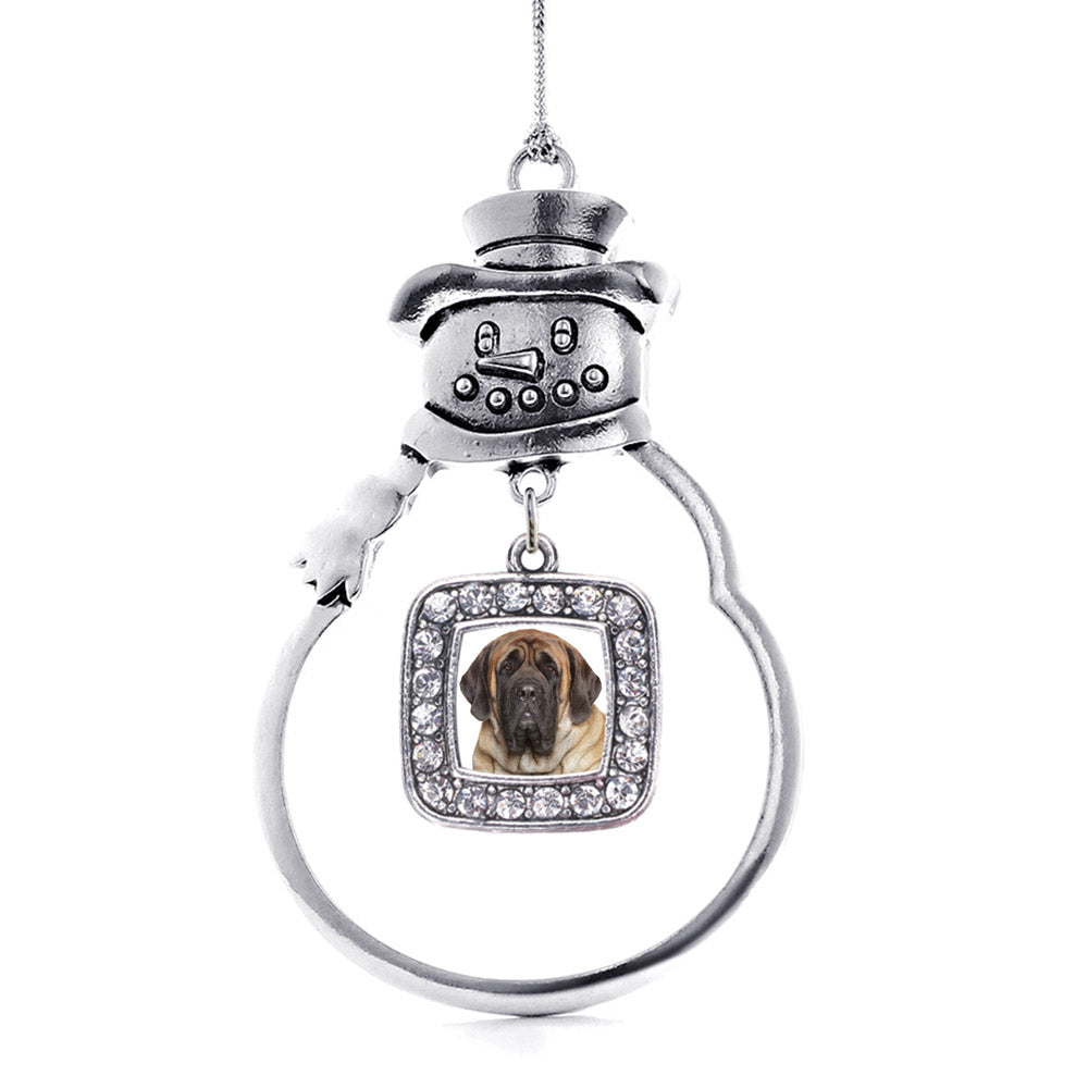 Our sparkling snowman ornament, equipped with a stylish silver rope and the Mastiff Face square charm, is crafted from white metal with a silver plated finish and accented with cubic zirconia stones.