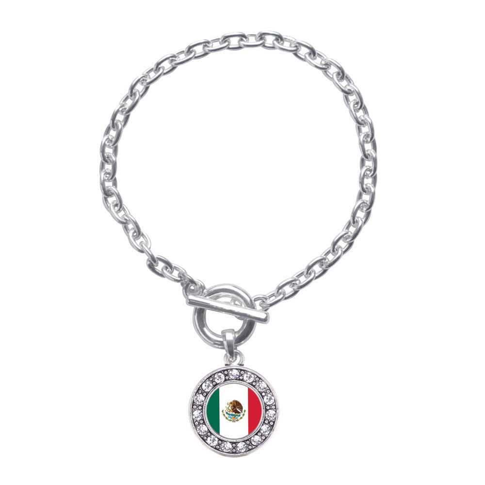 Our sparkling toggle bracelet, equipped with a stylish toggle clasp and the Mexican Flag circle charm, is crafted from white metal with a silver plated finish and accented with cubic zirconia stones.