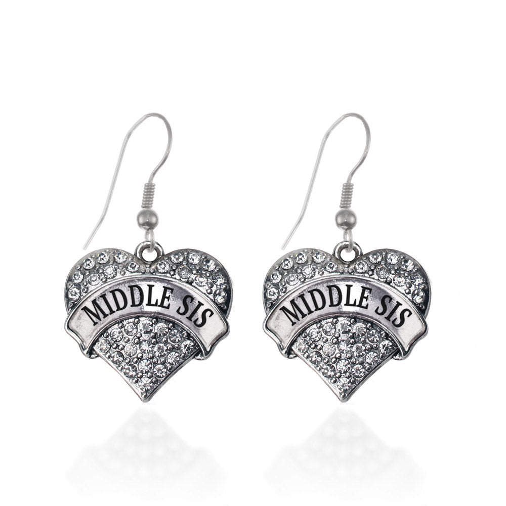 Silver Middle Sis Pave Heart Charm Dangle Earrings