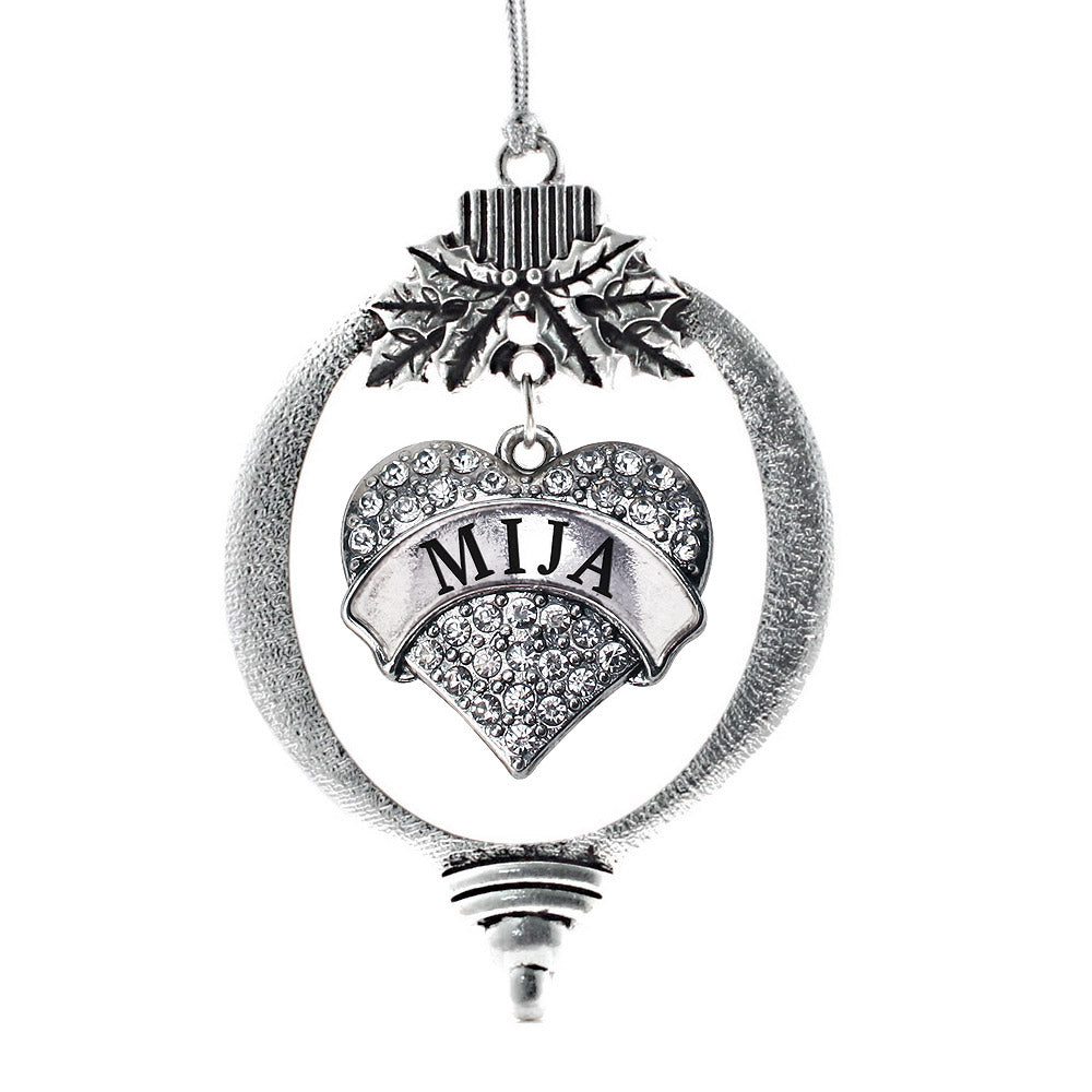 Our sparkling holiday ornament, equipped with a stylish silver rope and the Mija pave heart charm, is crafted from white metal with a silver plated finish and accented with cubic zirconia stones.