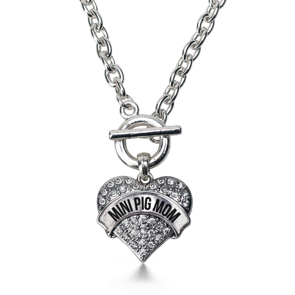 Our sparkling toggle necklace, equipped with a stylish toggle clasp and the Mini Pig Mom pave heart charm, is crafted from white metal with a silver plated finish and accented with cubic zirconia stones.