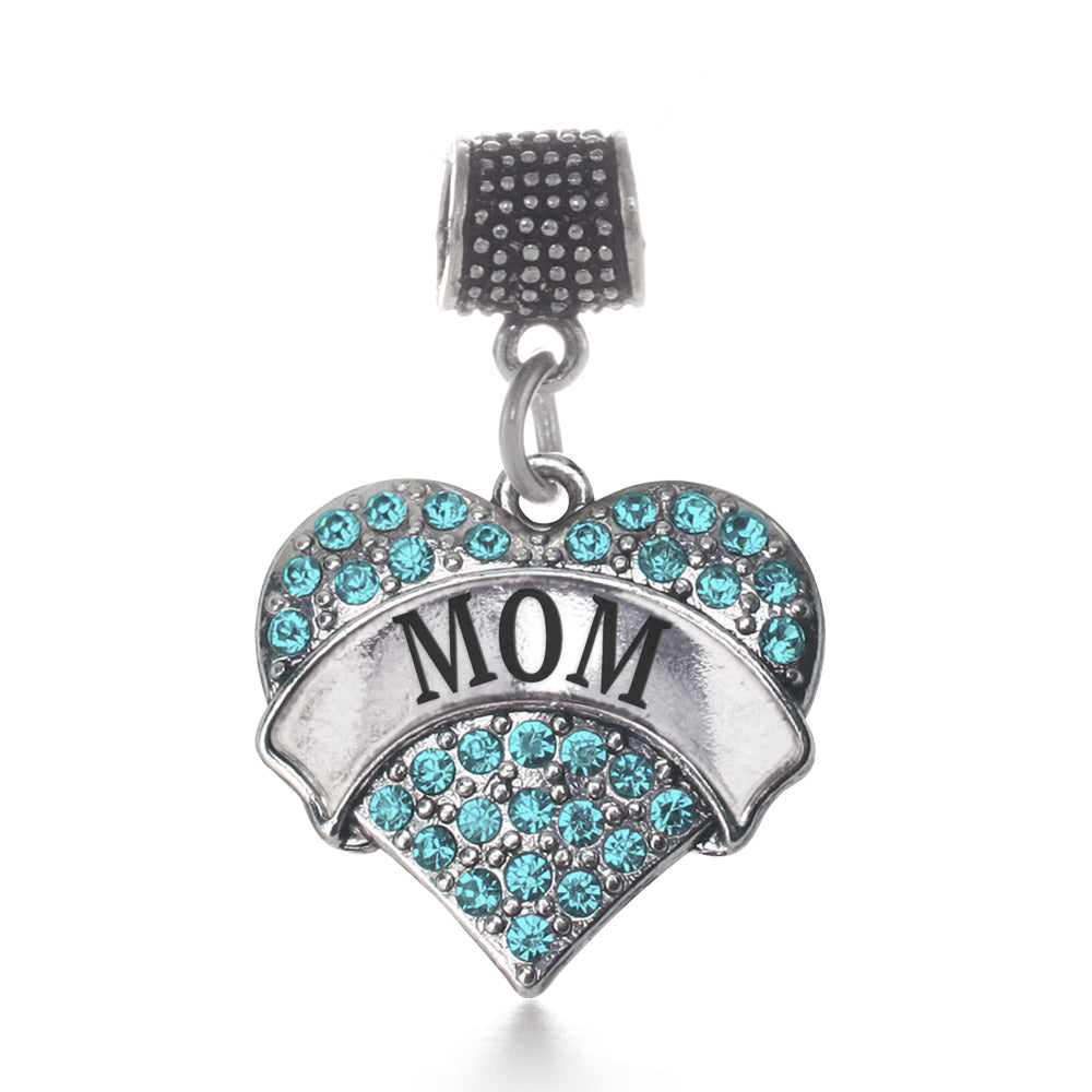 Our sparkling memory charm, equipped with a stylish charm attachment ring and the Mom Aqua aqua pave heart charm, is crafted from white metal with a silver plated finish and accented with cubic zirconia stones.