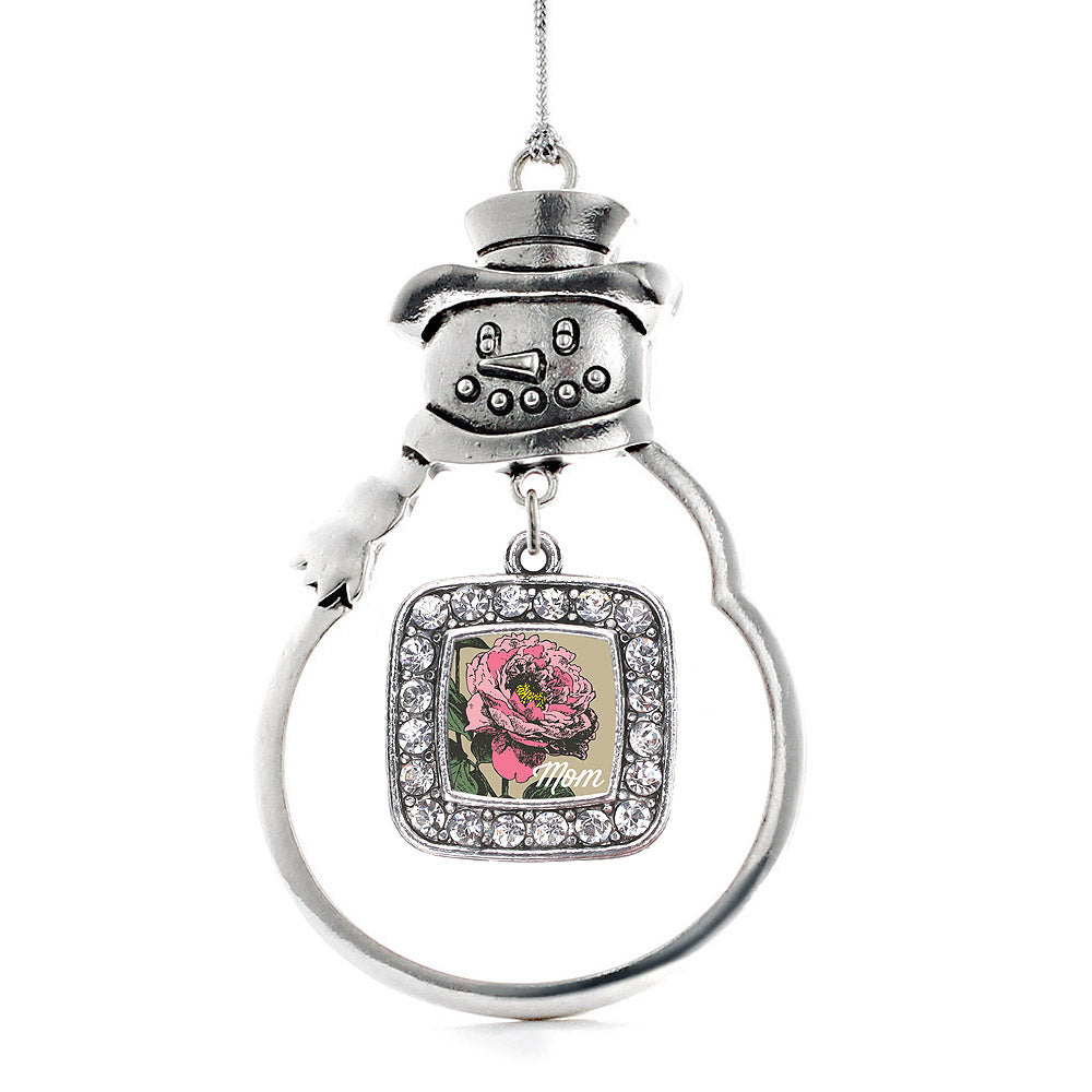 Silver Mom Peony Flower Square Charm Snowman Ornament