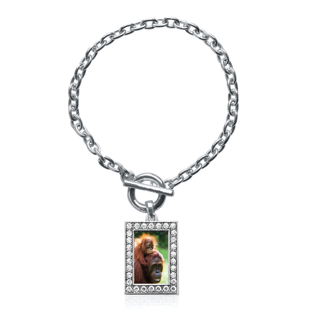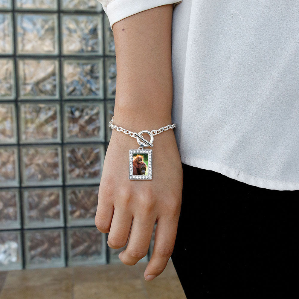 Our sparkling toggle bracelet, equipped with a stylish toggle clasp and the Momma and Baby Orangutans rectangle charm, is crafted from white metal with a silver plated finish and accented with cubic zirconia stones.