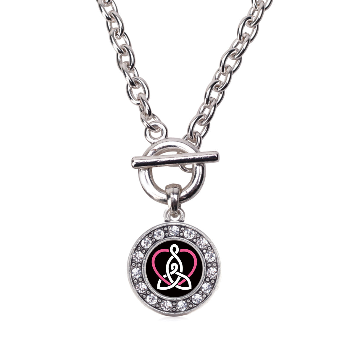 Our sparkling toggle necklace, equipped with a stylish toggle clasp and the Mother and Daughter Celtic Knot circle charm, is crafted from white metal with a silver plated finish and accented with cubic zirconia stones.