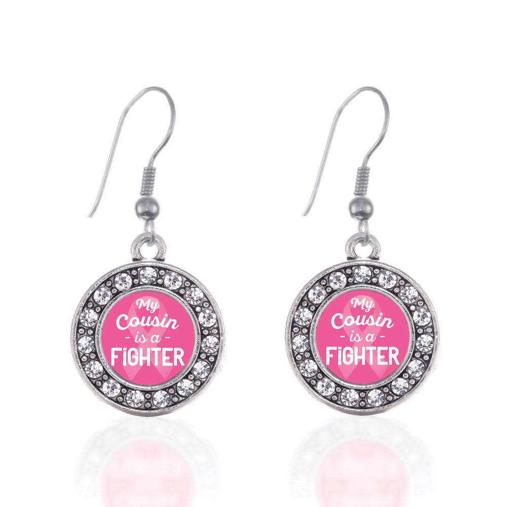 Silver My Cousin is a Fighter Breast Cancer Awareness Circle Charm Dangle Earrings