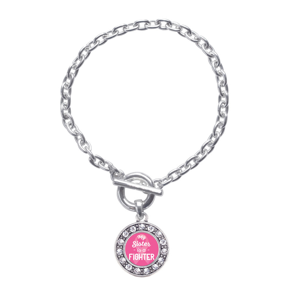 Silver My Sister is a Fighter Breast Cancer Awareness Circle Charm Toggle Bracelet