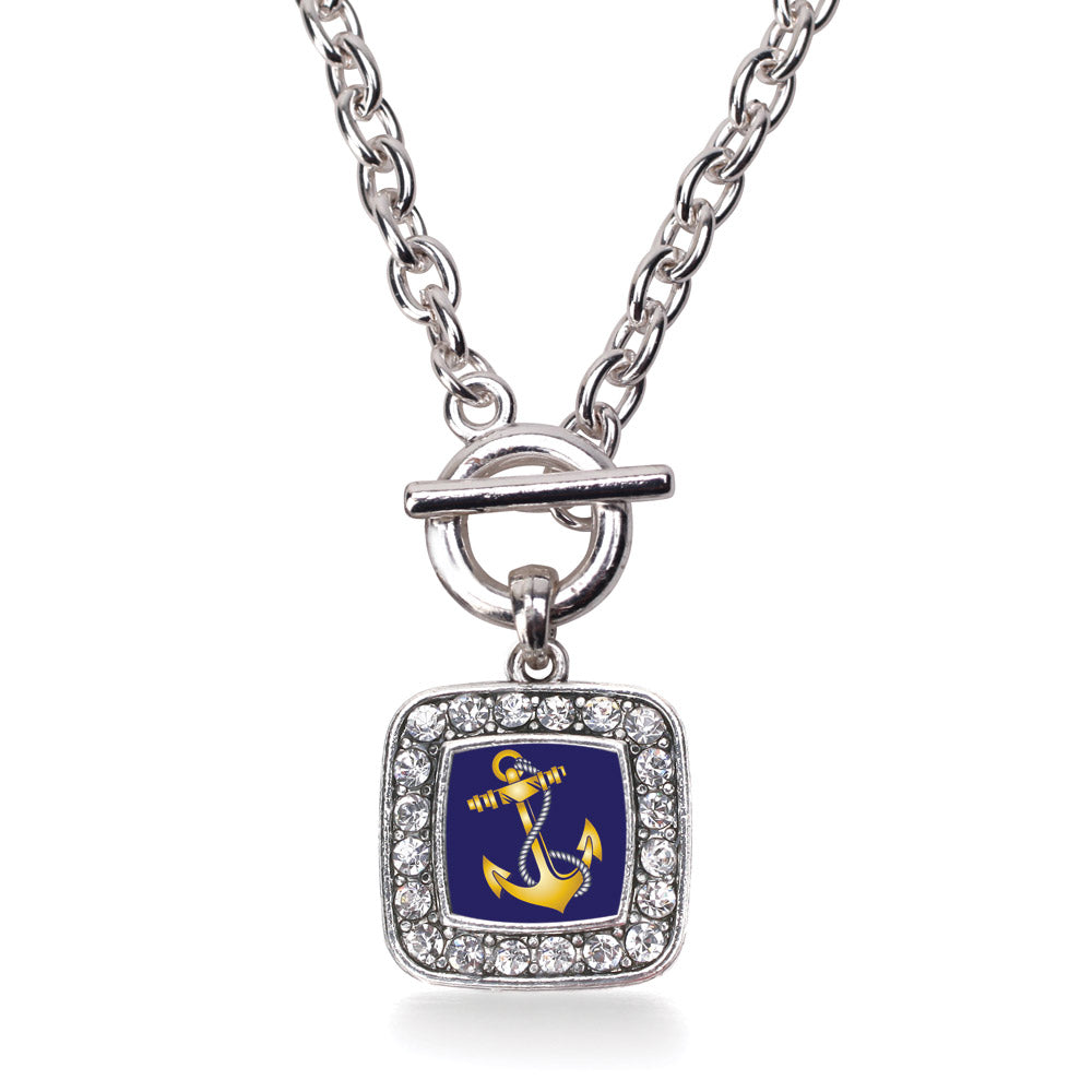 Our sparkling toggle necklace, equipped with a stylish toggle clasp and the Navy Anchor square charm, is crafted from white metal with a silver plated finish and accented with cubic zirconia stones.
