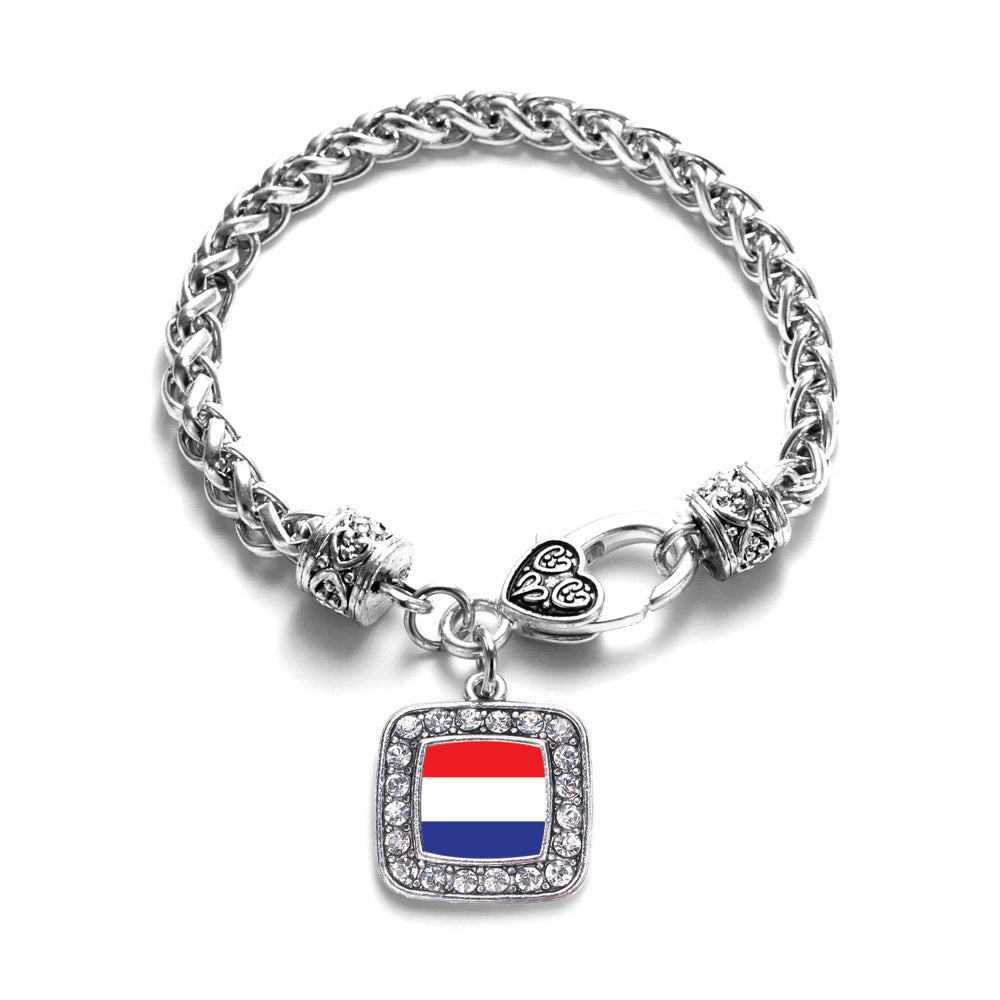 Our sparkling braided bracelet, equipped with a stylish lobster claw clasp and the Netherlands Flag square charm, is crafted from white metal with a silver plated finish and accented with cubic zirconia stones.