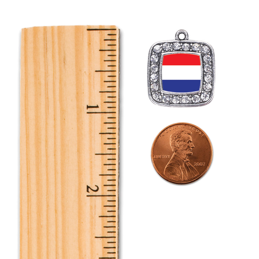 Our sparkling holiday ornament, equipped with a stylish silver rope and the Netherlands Flag square charm, is crafted from white metal with a silver plated finish and accented with cubic zirconia stones.