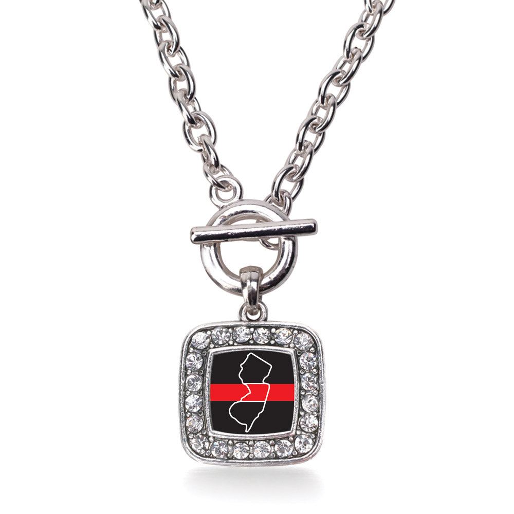 Our sparkling toggle necklace, equipped with a stylish toggle clasp and the New Jersey Thin Red Line square charm, is crafted from white metal with a silver plated finish and accented with cubic zirconia stones.