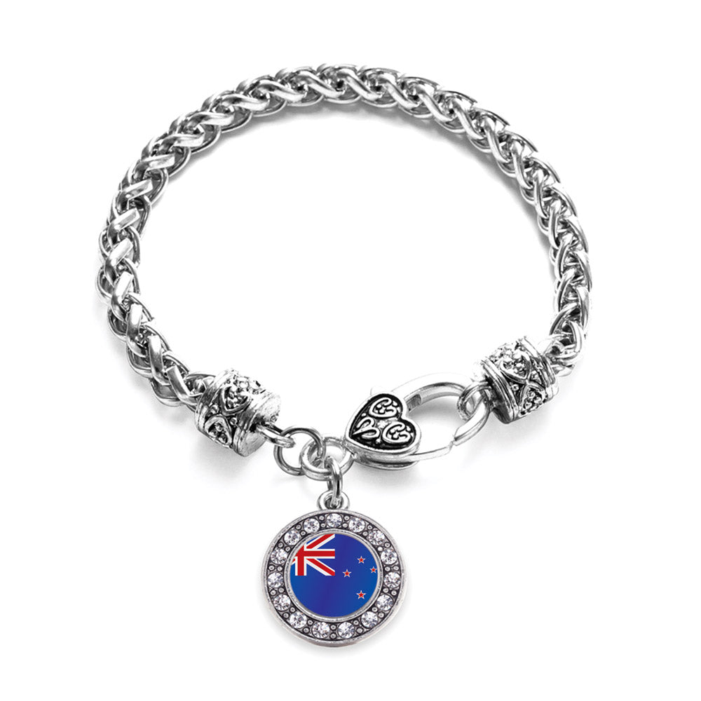 Our sparkling braided bracelet, equipped with a stylish lobster claw clasp and the New Zealand Flag circle charm, is crafted from white metal with a silver plated finish and accented with cubic zirconia stones.