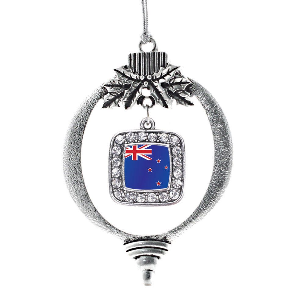 Our sparkling holiday ornament, equipped with a stylish silver rope and the New Zealand Flag square charm, is crafted from white metal with a silver plated finish and accented with cubic zirconia stones.