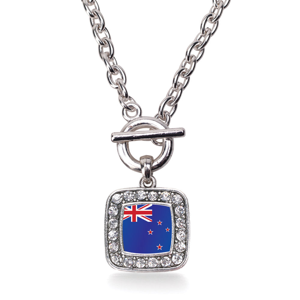 Our sparkling toggle necklace, equipped with a stylish toggle clasp and the New Zealand Flag square charm, is crafted from white metal with a silver plated finish and accented with cubic zirconia stones.