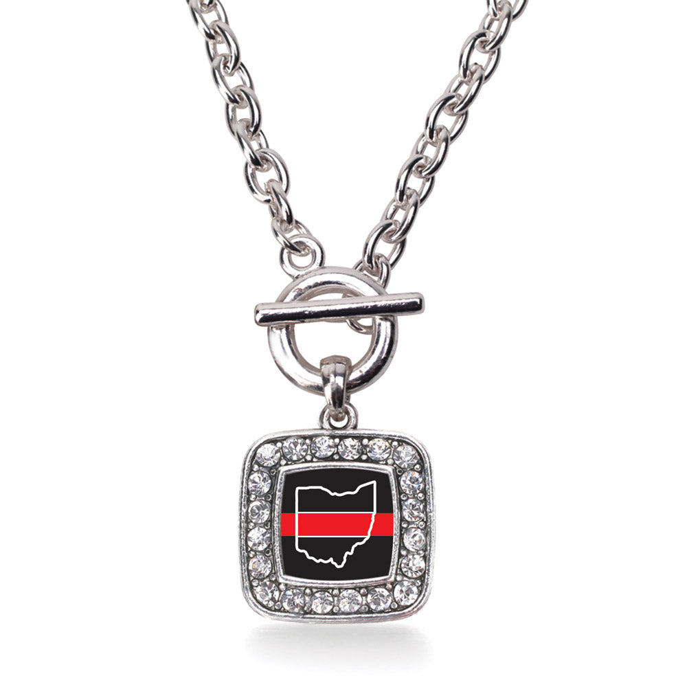 Our sparkling toggle necklace, equipped with a stylish toggle clasp and the Ohio Thin Red Line square charm, is crafted from white metal with a silver plated finish and accented with cubic zirconia stones.