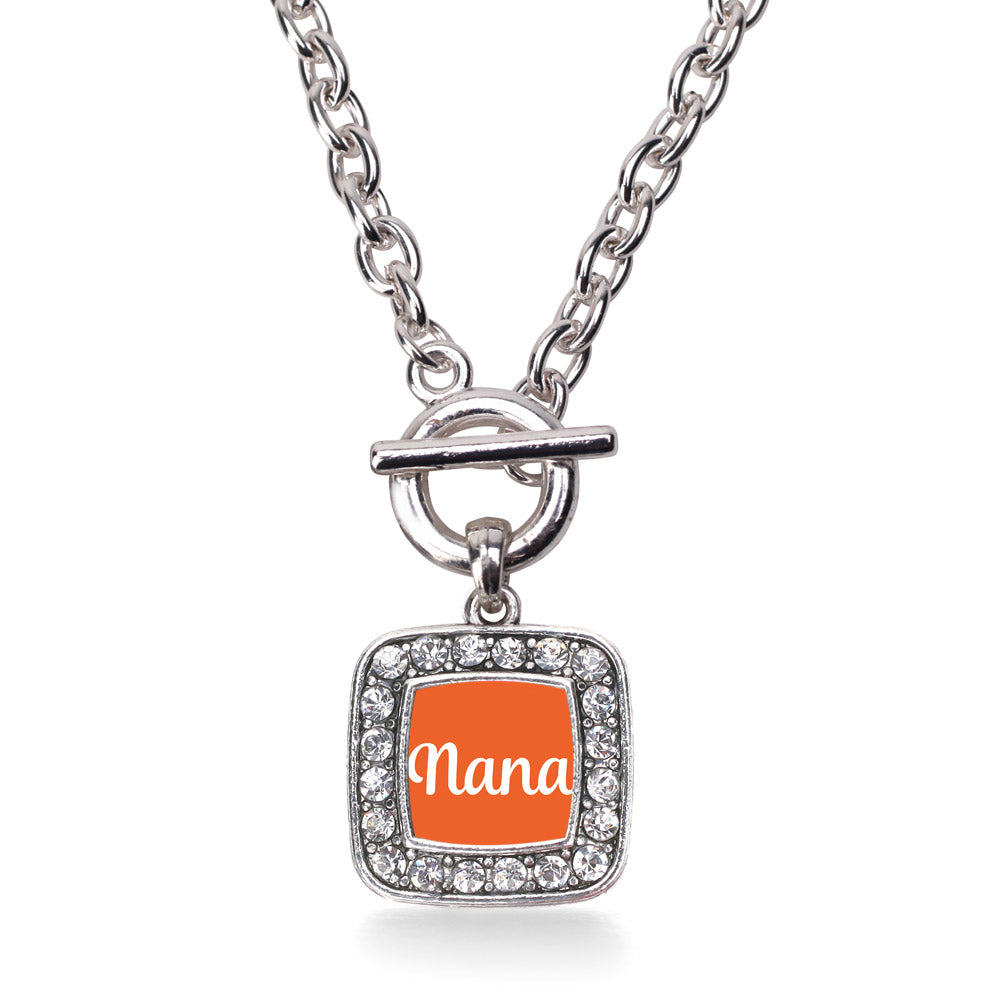 Our sparkling toggle necklace, equipped with a stylish toggle clasp and the Orange Nana square charm, is crafted from white metal with a silver plated finish and accented with cubic zirconia stones.
