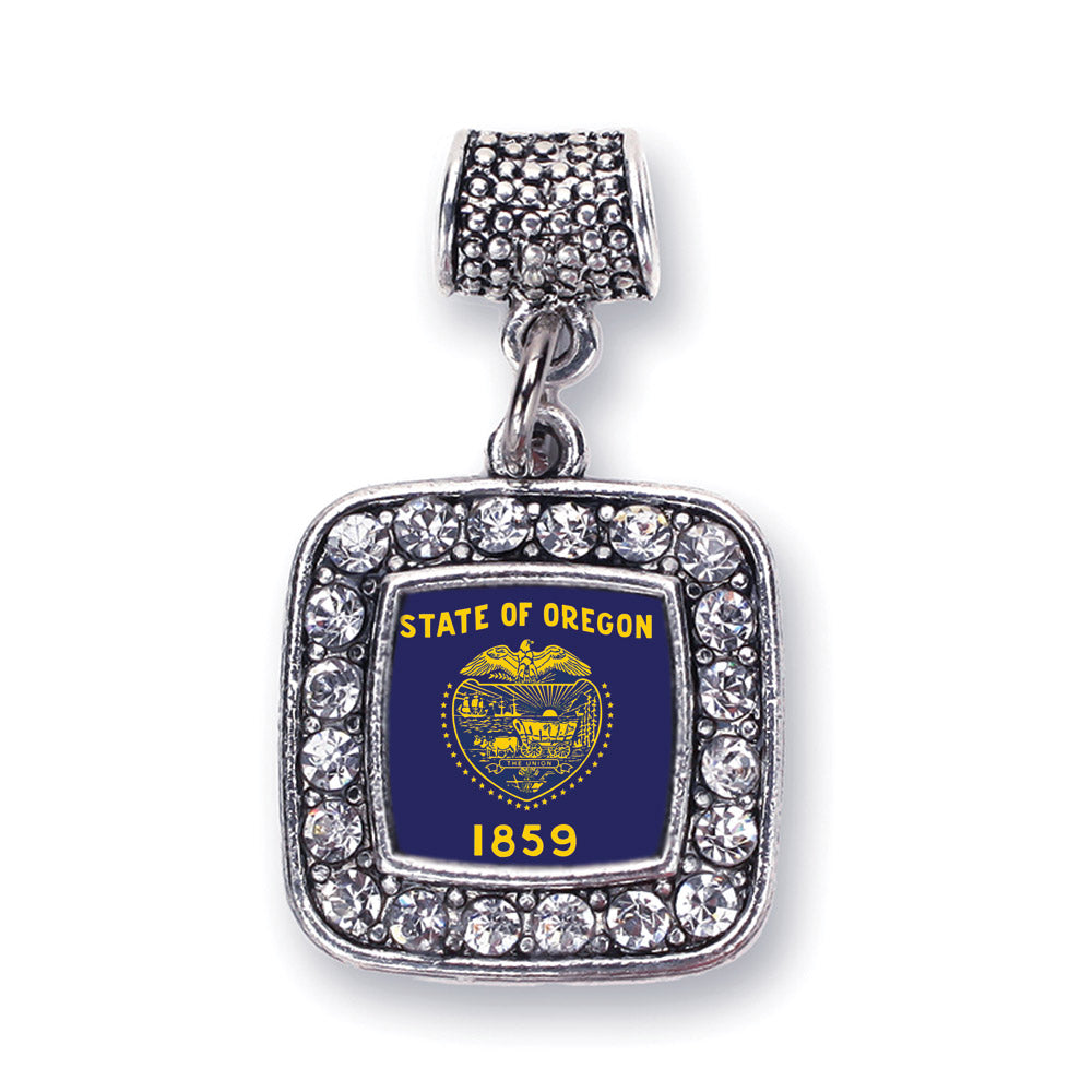 Our sparkling memory charm, equipped with a stylish charm attachment ring and the Oregon Flag square charm, is crafted from white metal with a silver plated finish and accented with cubic zirconia stones.