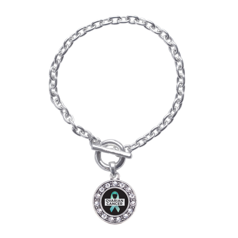 Our sparkling toggle bracelet, equipped with a stylish toggle clasp and the Ovarian Cancer circle charm, is crafted from white metal with a silver plated finish and accented with cubic zirconia stones.