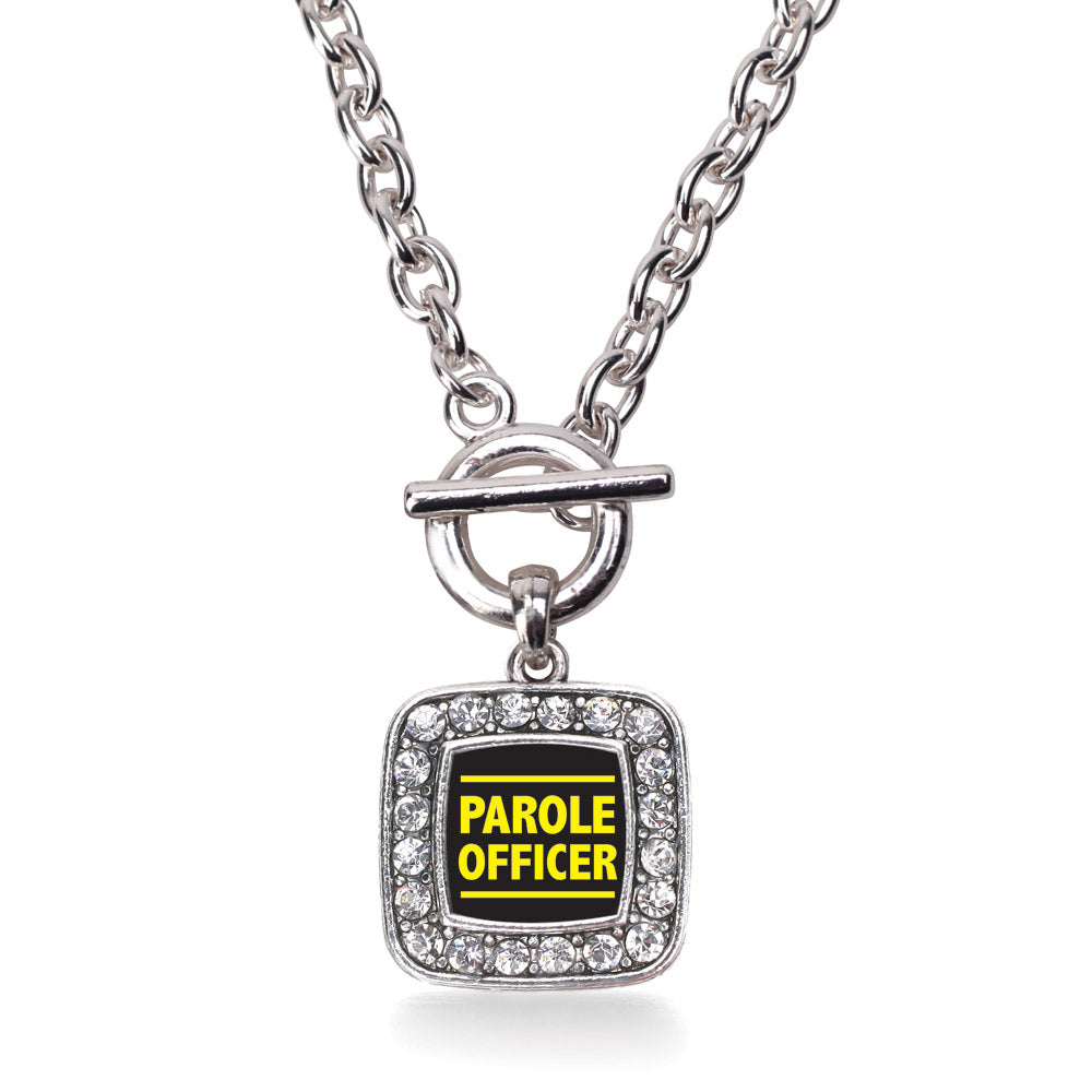 Our sparkling toggle necklace, equipped with a stylish toggle clasp and the Parole Officer square charm, is crafted from white metal with a silver plated finish and accented with cubic zirconia stones.