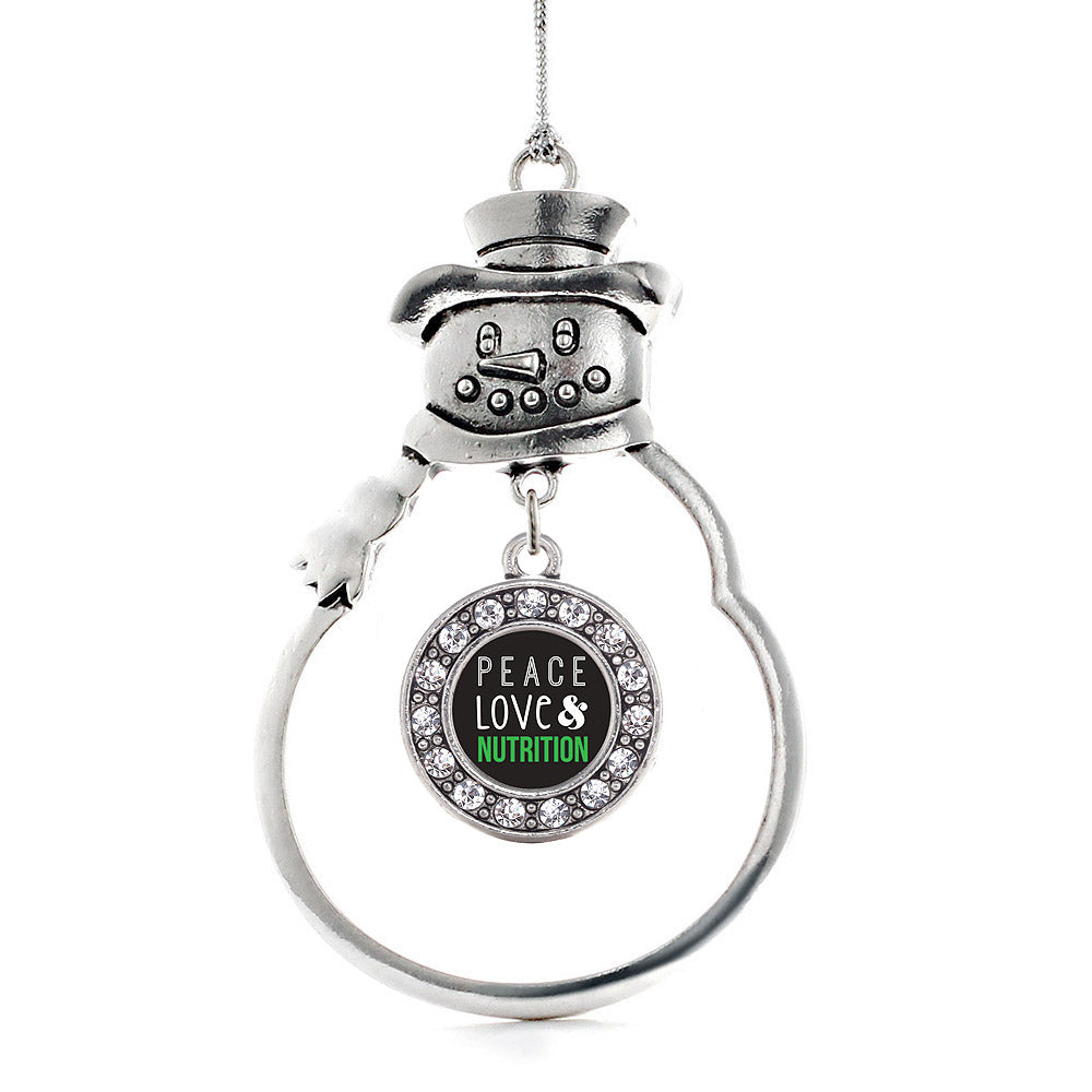 Our sparkling snowman ornament, equipped with a stylish silver rope and the Peace, Love, and Nutrition circle charm, is crafted from white metal with a silver plated finish and accented with cubic zirconia stones.