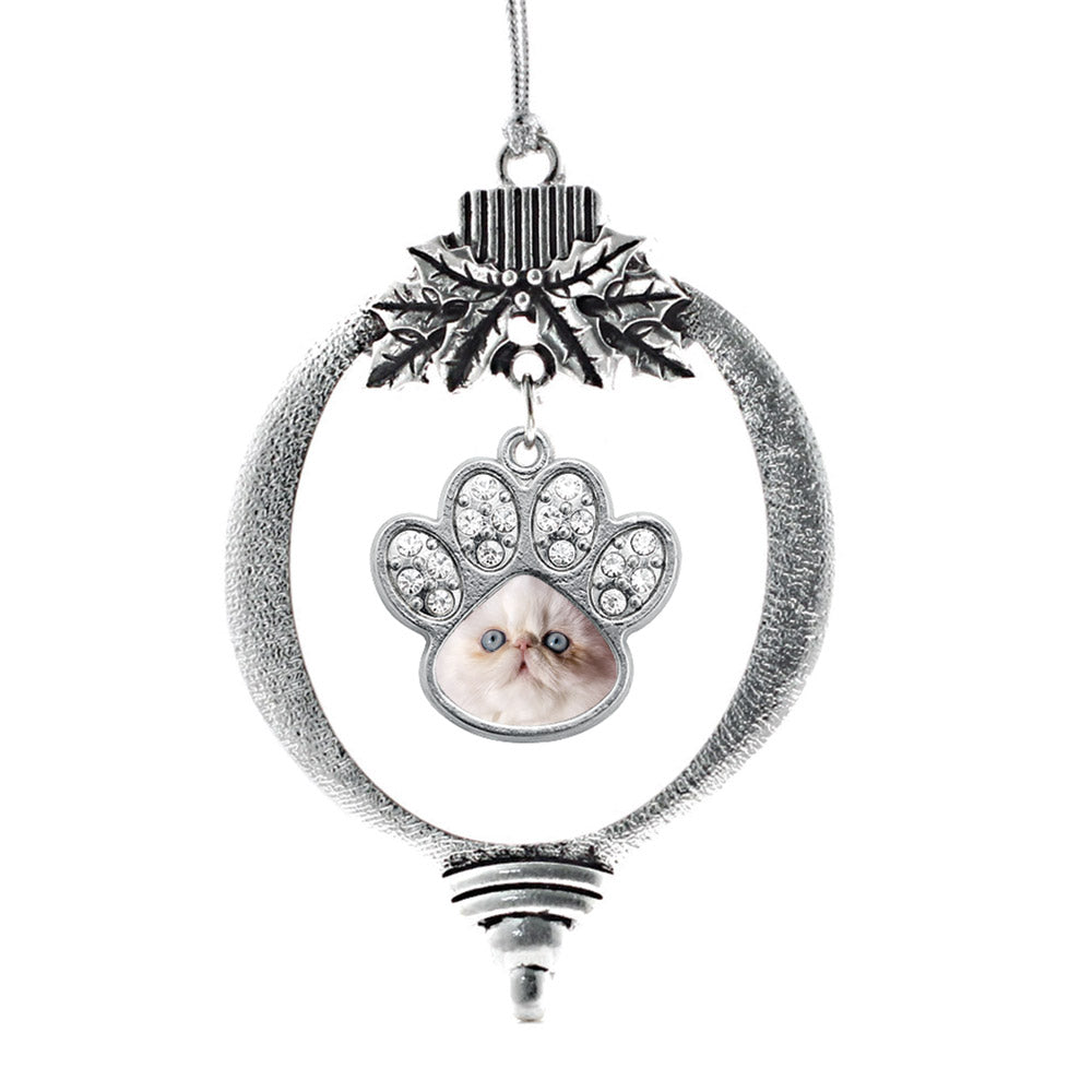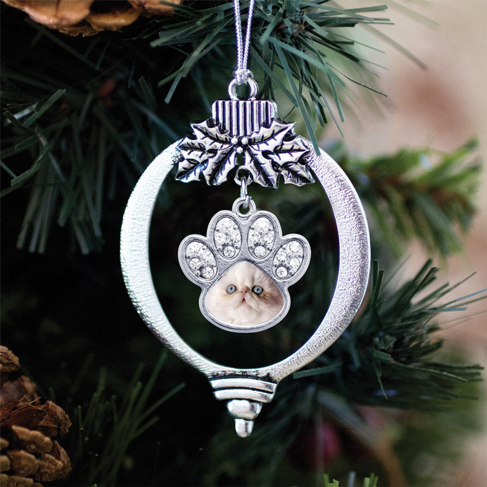 Our sparkling holiday ornament, equipped with a stylish silver rope and the Persian Cat pave paw charm, is crafted from white metal with a silver plated finish and accented with cubic zirconia stones.
