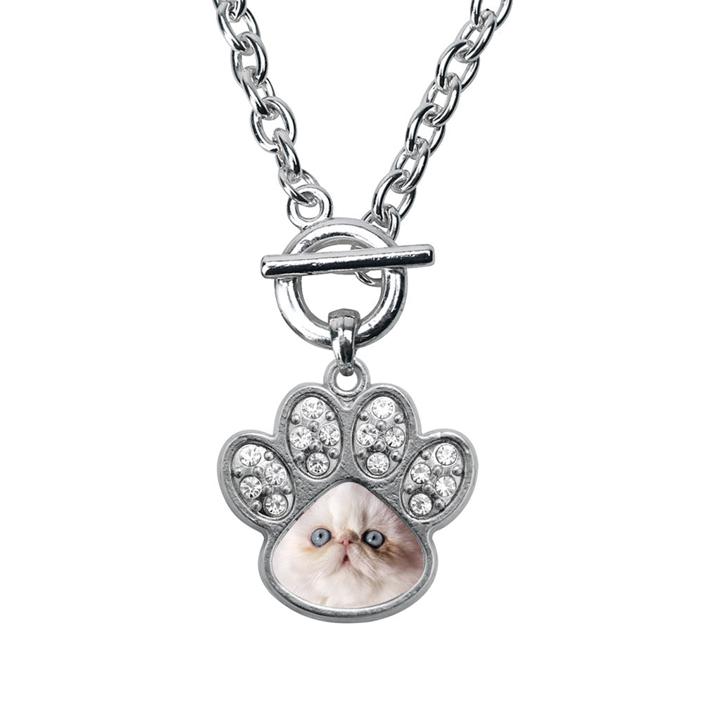 Silver Persian Cat Pave Paw Charm Toggle Necklace