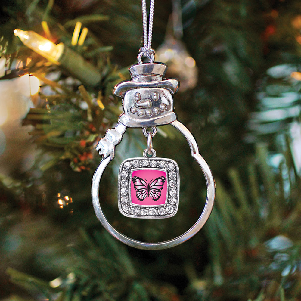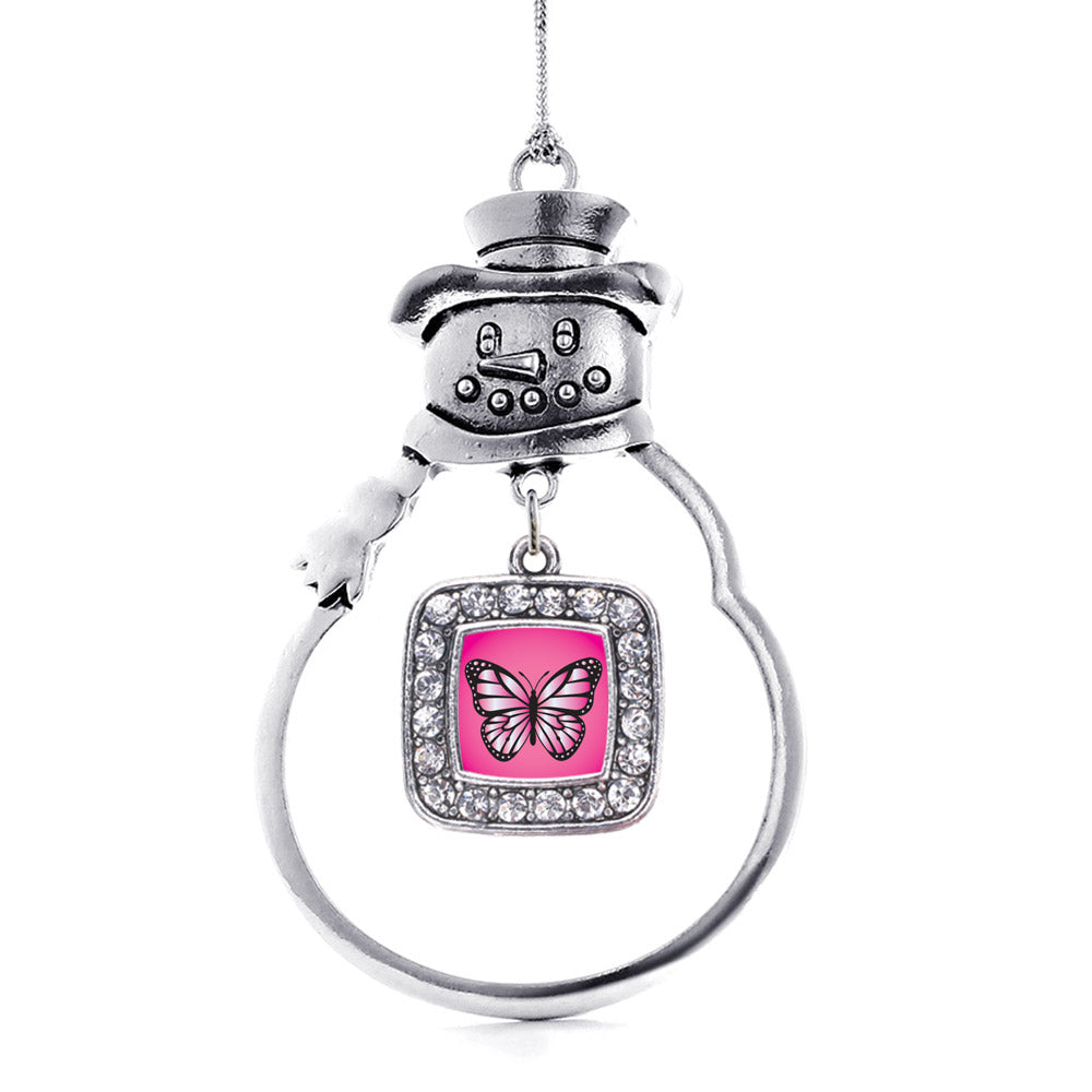 Silver Pink Butterfly Square Charm Snowman Ornament