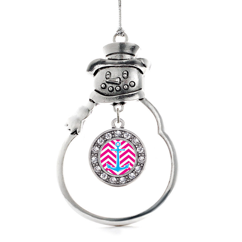 Our sparkling snowman ornament, equipped with a stylish silver rope and the Pink Chevron Blue Anchor circle charm, is crafted from white metal with a silver plated finish and accented with cubic zirconia stones.