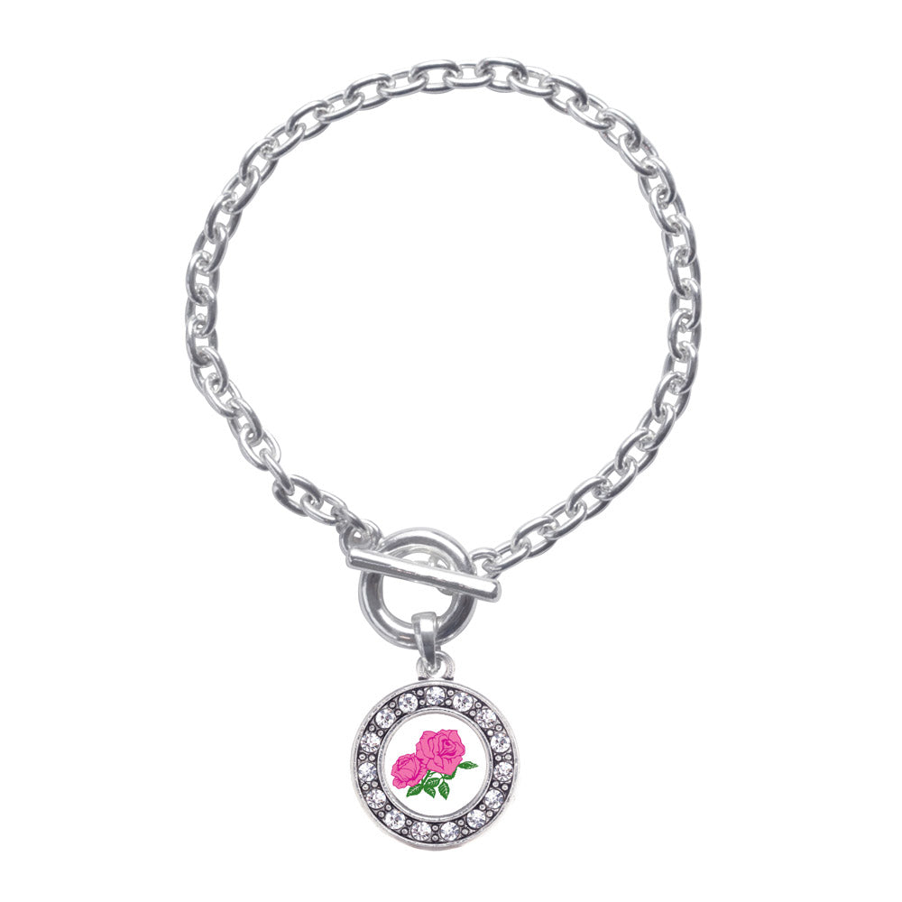Silver Pink Rose Circle Charm Toggle Bracelet