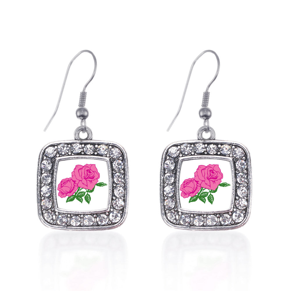 Our sparkling dangle earrings, equipped with a stylish french hook backing and the Pink Rose square charm, is crafted from white metal with a silver plated finish and accented with cubic zirconia stones.