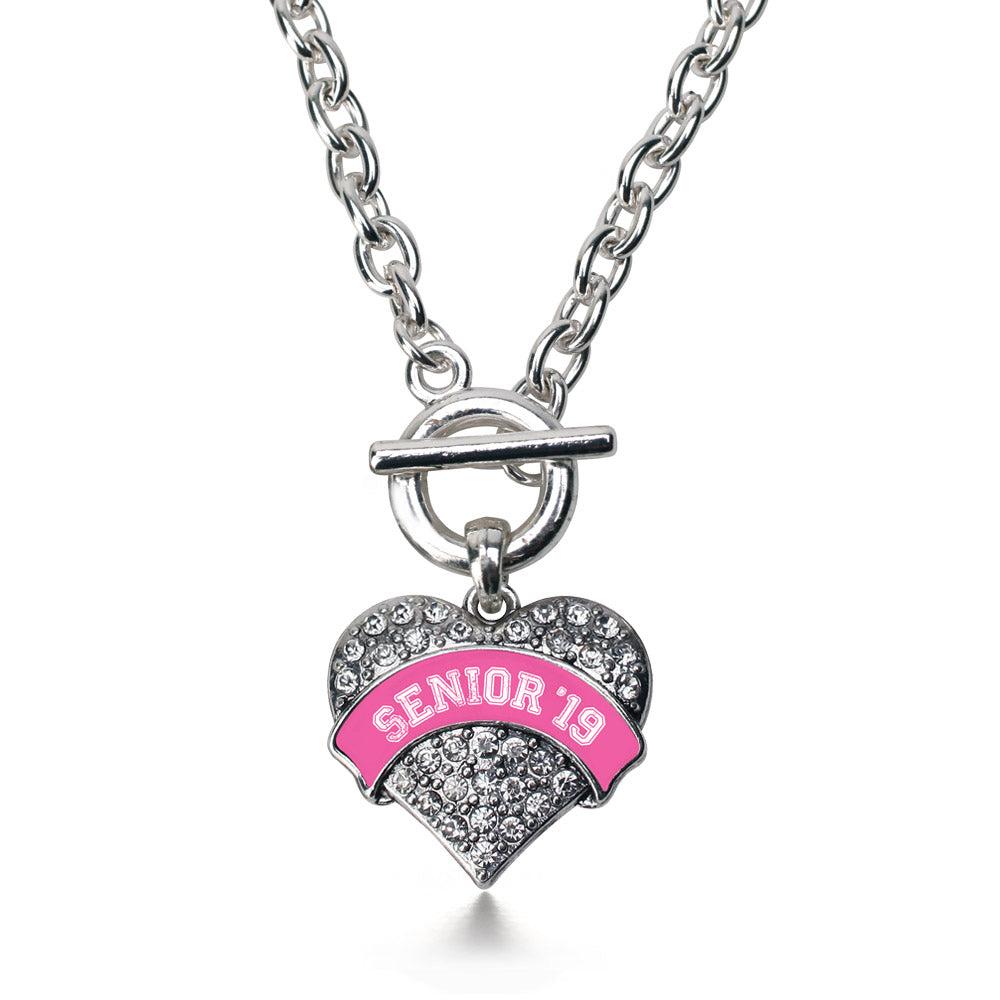 Silver Pink Senior 2019 Pave Heart Charm Toggle Necklace