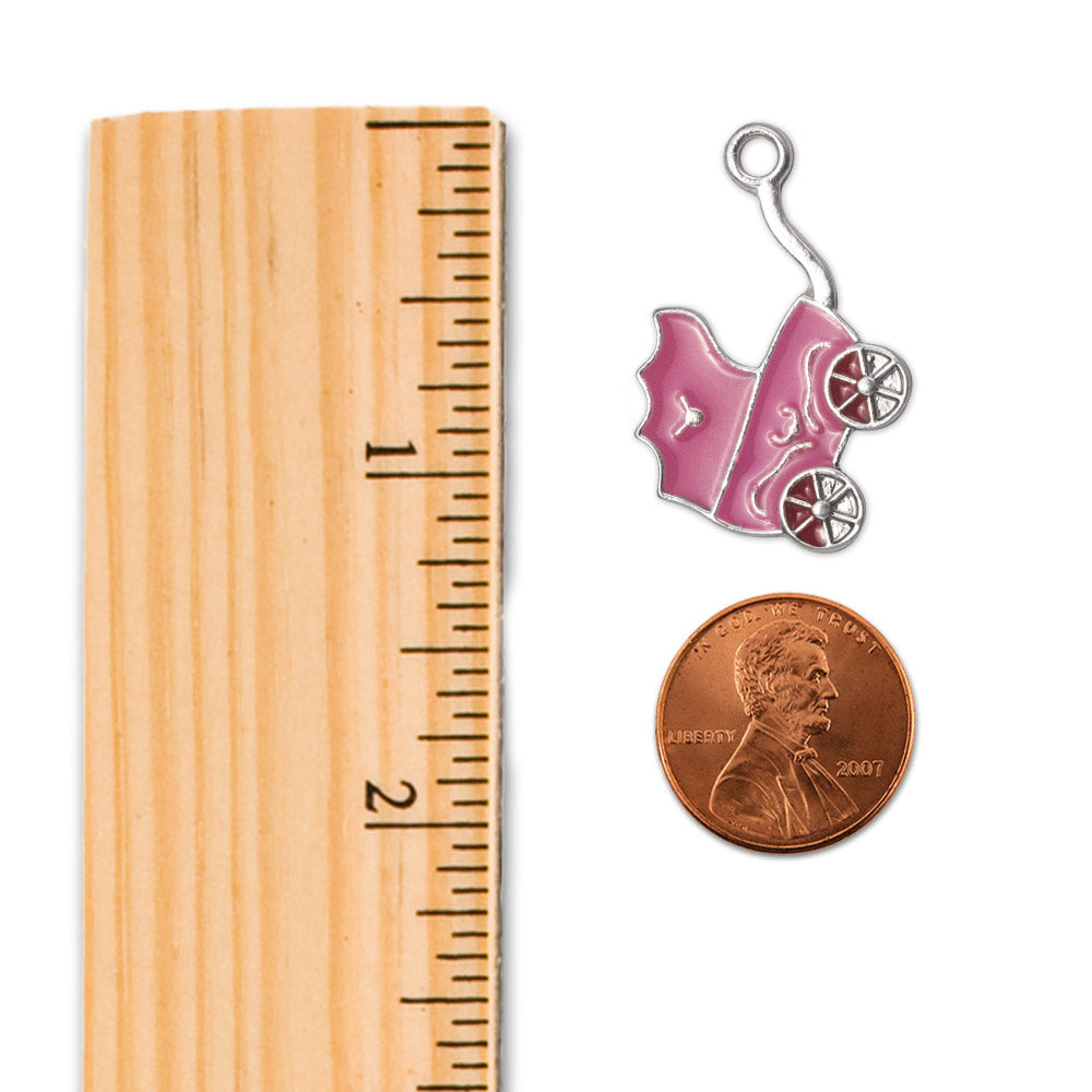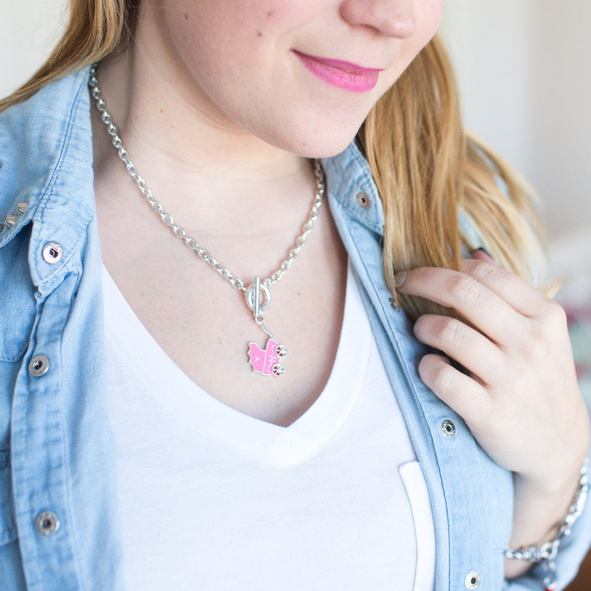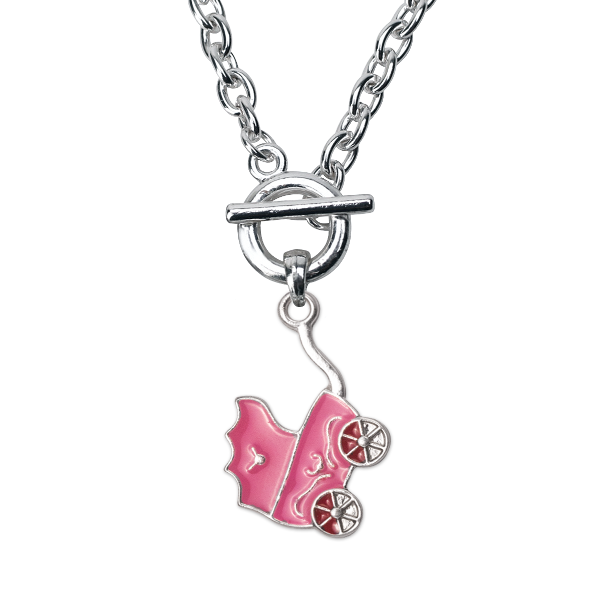 Our sparkling toggle necklace, equipped with a stylish toggle clasp and the Pink Stroller charm, is crafted from white metal with a silver plated finish.
