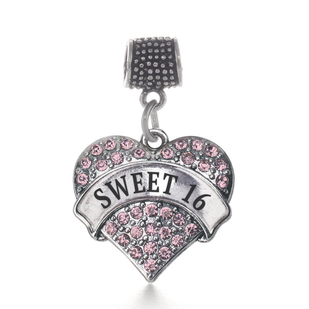 Our sparkling memory charm, equipped with a stylish charm attachment ring and the Pink Sweet 16 pink pave heart charm, is crafted from white metal with a silver plated finish and accented with cubic zirconia stones.