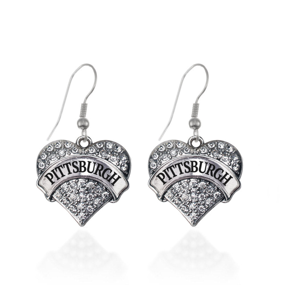 Our sparkling dangle earrings, equipped with a stylish french hook backing and the Pittsburgh pave heart charm, is crafted from white metal with a silver plated finish and accented with cubic zirconia stones.