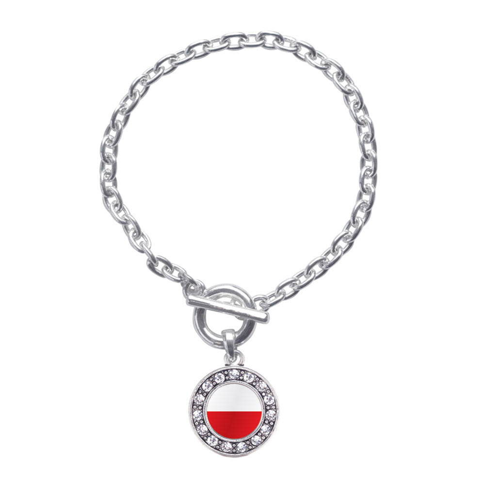 Our sparkling toggle bracelet, equipped with a stylish toggle clasp and the Poland Flag circle charm, is crafted from white metal with a silver plated finish and accented with cubic zirconia stones.