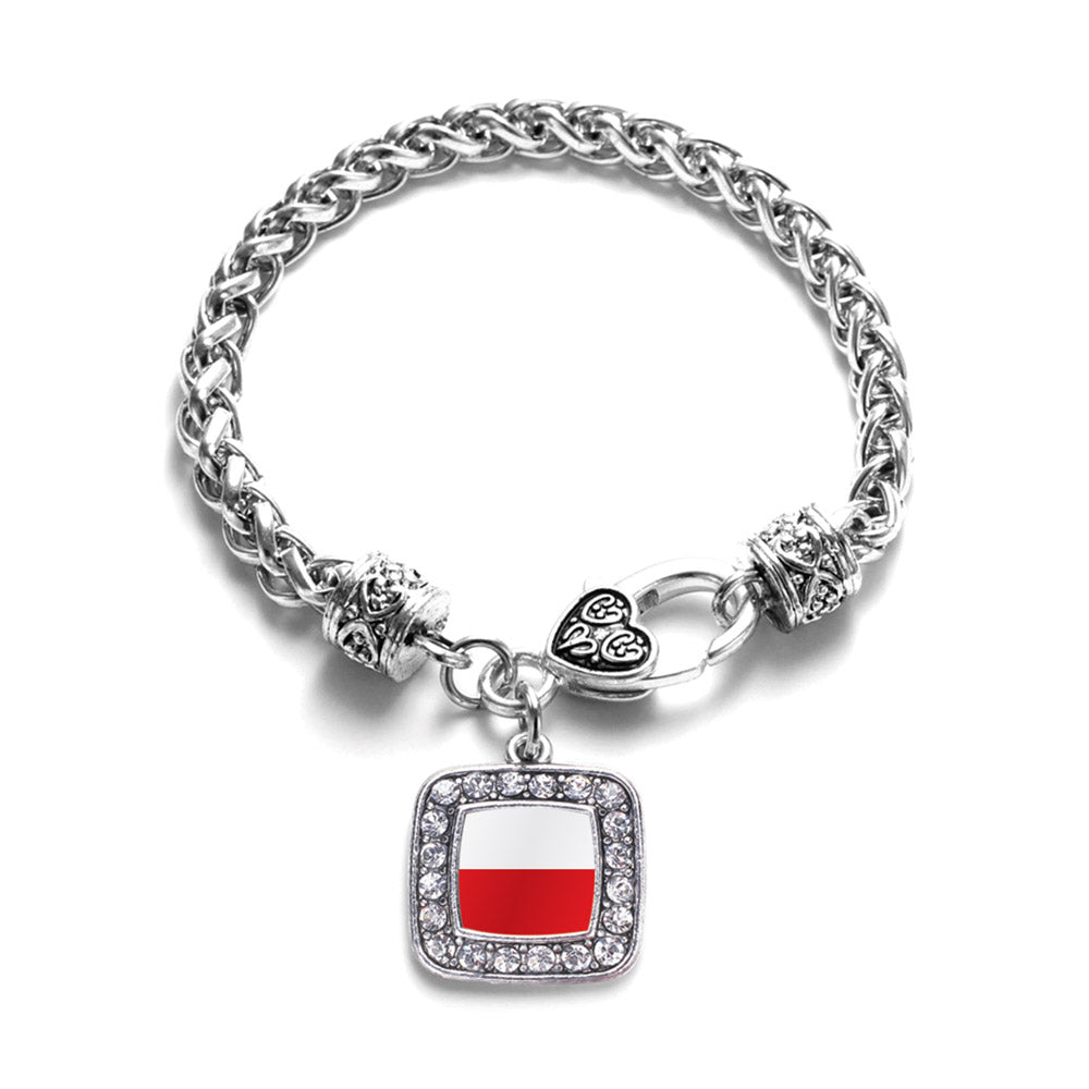 Our sparkling braided bracelet, equipped with a stylish lobster claw clasp and the Poland Flag square charm, is crafted from white metal with a silver plated finish and accented with cubic zirconia stones.