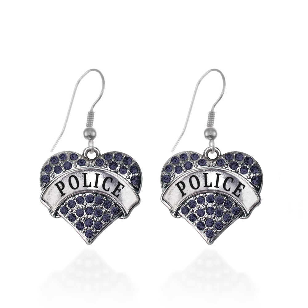Silver Police Blue Pave Heart Charm Dangle Earrings