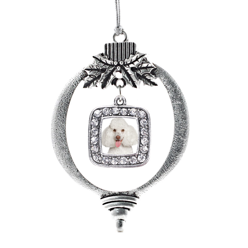 Our sparkling holiday ornament, equipped with a stylish silver rope and the Poodle Face square charm, is crafted from white metal with a silver plated finish and accented with cubic zirconia stones.