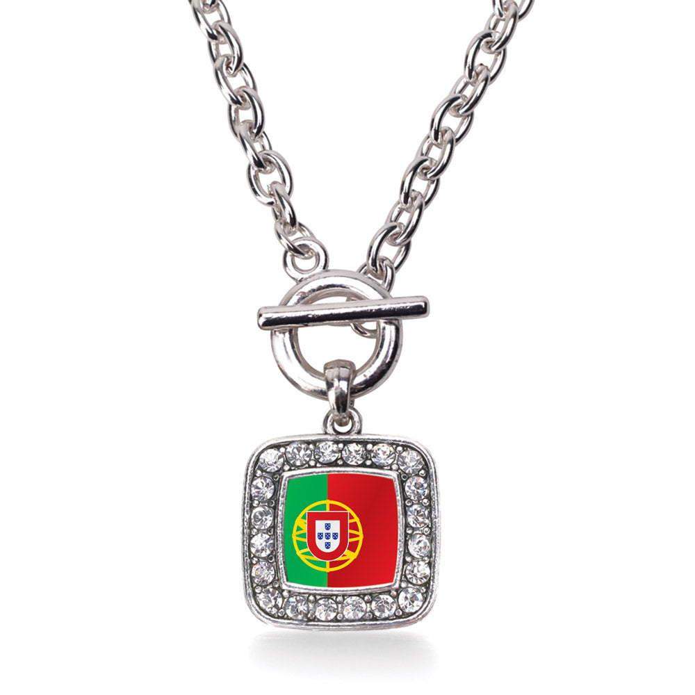 Our sparkling toggle necklace, equipped with a stylish toggle clasp and the Portugal Flag square charm, is crafted from white metal with a silver plated finish and accented with cubic zirconia stones.
